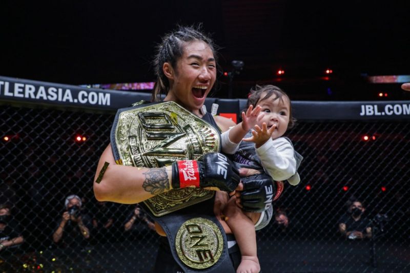 Petarung Angela Lee bersama sang anak membawa sabuk juara dunia ONE Women's Atomweight setelah mengalahkan Juara ONE Women's Atomweight World Grand Prix Stamp Fairtex pada laga momen satu dekade ONE Championship di Singapura, Sabtu malam (26/3/2022). ANTARA/HO/ONE Championship