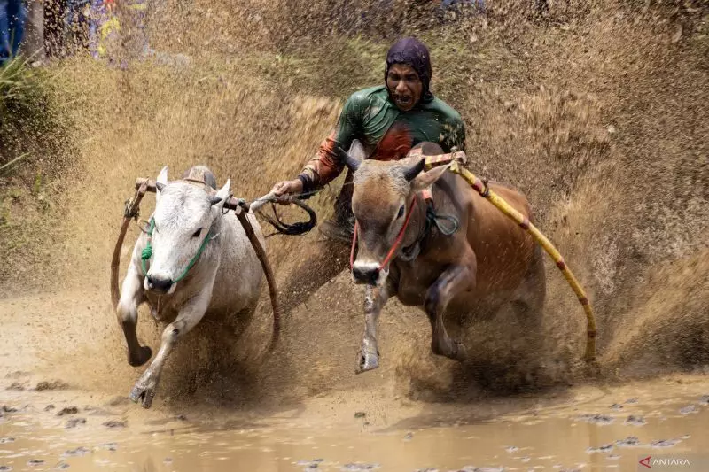 Seorang joki memacu dua ekor sapi dalam tradisi pacu jawi yang diselenggarakan masyarakat nagari di Kabupaten Tanah Datar, 25 Oktober 2025. ANTARA/Muhammad Zulfikar.