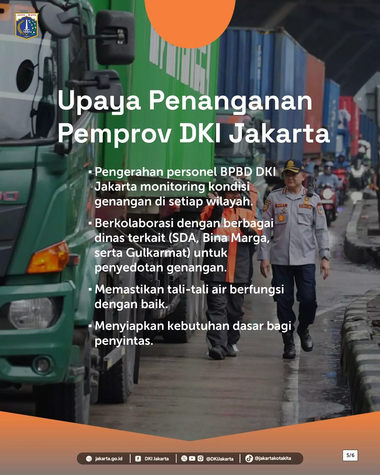 BPBD DKI Jakarta telah mengerahkan personel untuk memantau kondisi genangan dan mengoordinasikan penanganan bersama Dinas Sumber Daya Air, Dinas Bina Marga, serta Dinas Penanggulangan Kebakaran dan Penyelamatan. Upaya dilakukan melalui penyedotan genangan, pengecekan saluran air, serta pemenuhan kebutuhan dasar bagi warga terdampak.