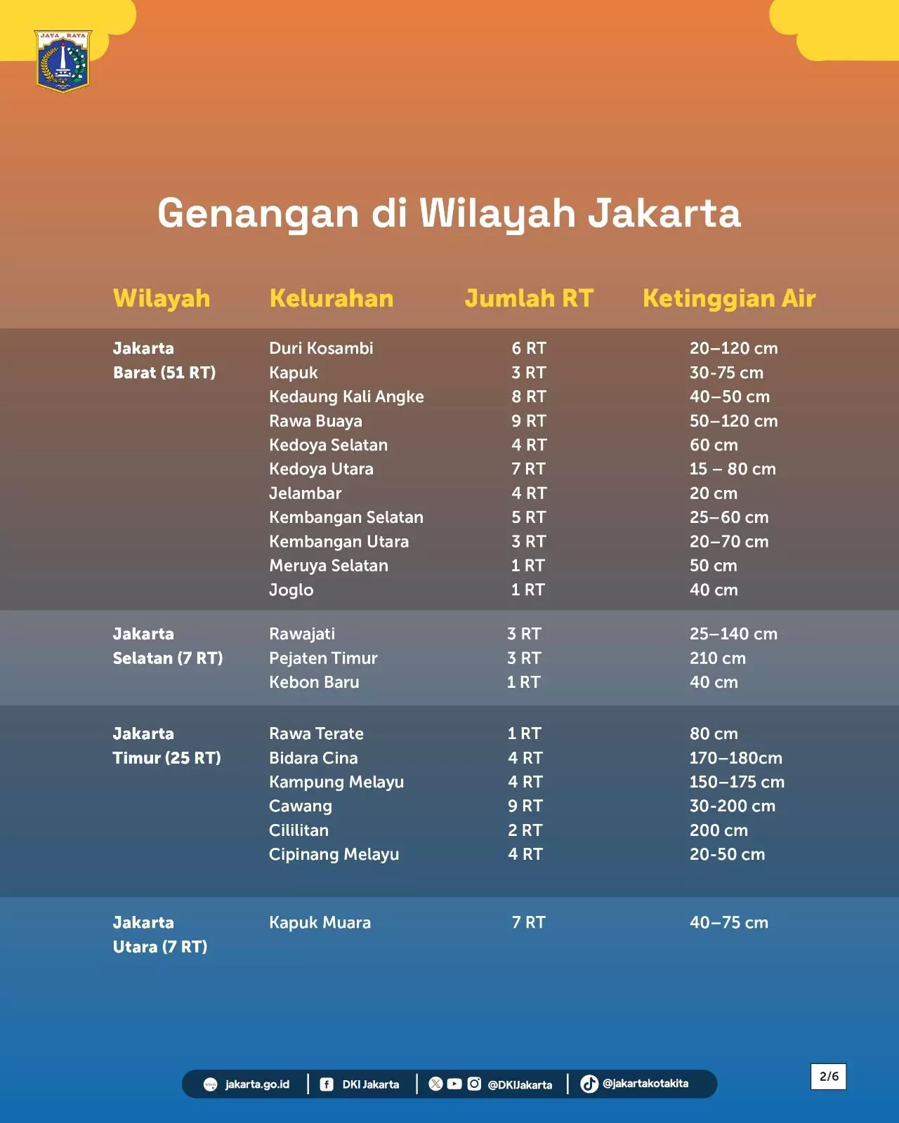 Jakarta Barat menjadi wilayah dengan dampak terluas, mencatat 51 RT tergenang di 11 kelurahan, dengan ketinggian air berkisar 15 hingga 120 sentimeter. Genangan disebabkan oleh curah hujan tinggi serta luapan Kali Angke dan Kali Pesanggrahan.
