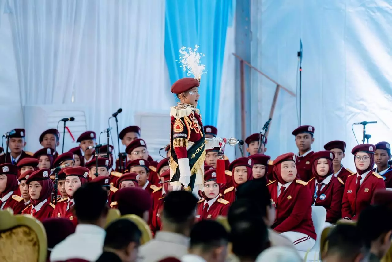 Rachmad Albi Fakhri (12) menjadi perhatian saat tampil sebagai Komandan Peleton (Danton) Baris Variasi pada peresmian 166 Sekolah Rakyat di Balai Besar Pendidikan dan Pelatihan Kesejahteraan Sosial (BBPPKS) Banjarmasin, Banjarbaru, Kalimantan Selatan, Senin (12/1/2026). Penampilan tersebut disaksikan langsung Presiden Prabowo Subianto.