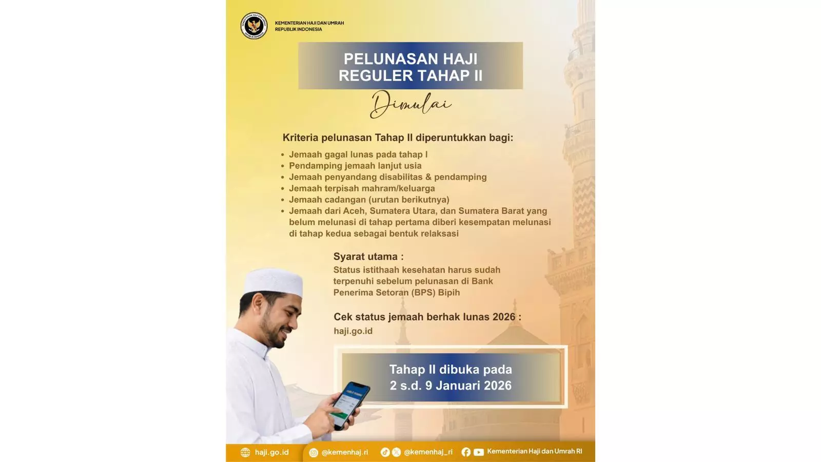 Direktur Pelayanan Haji Dalam Negeri Kementerian Haji dan Umrah RI, Nurchalis, mengatakan pembukaan pelunasan tahap II ini menjadi peluang bagi jemaah yang memenuhi kriteria tertentu agar dapat memastikan keberangkatan pada musim haji tahun 2026.