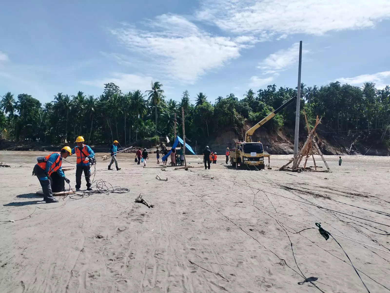 Petugas PLN UID Jakarta Raya melakukan pekerjaan pemulihan jaringan listrik pasca bencana banjir dan tanah longsor di wilayah Aceh dengan mendirikan tiang dan menarik jaringan tegangan menengah di lokasi terdampak. Foto : PLN UID Jakarta