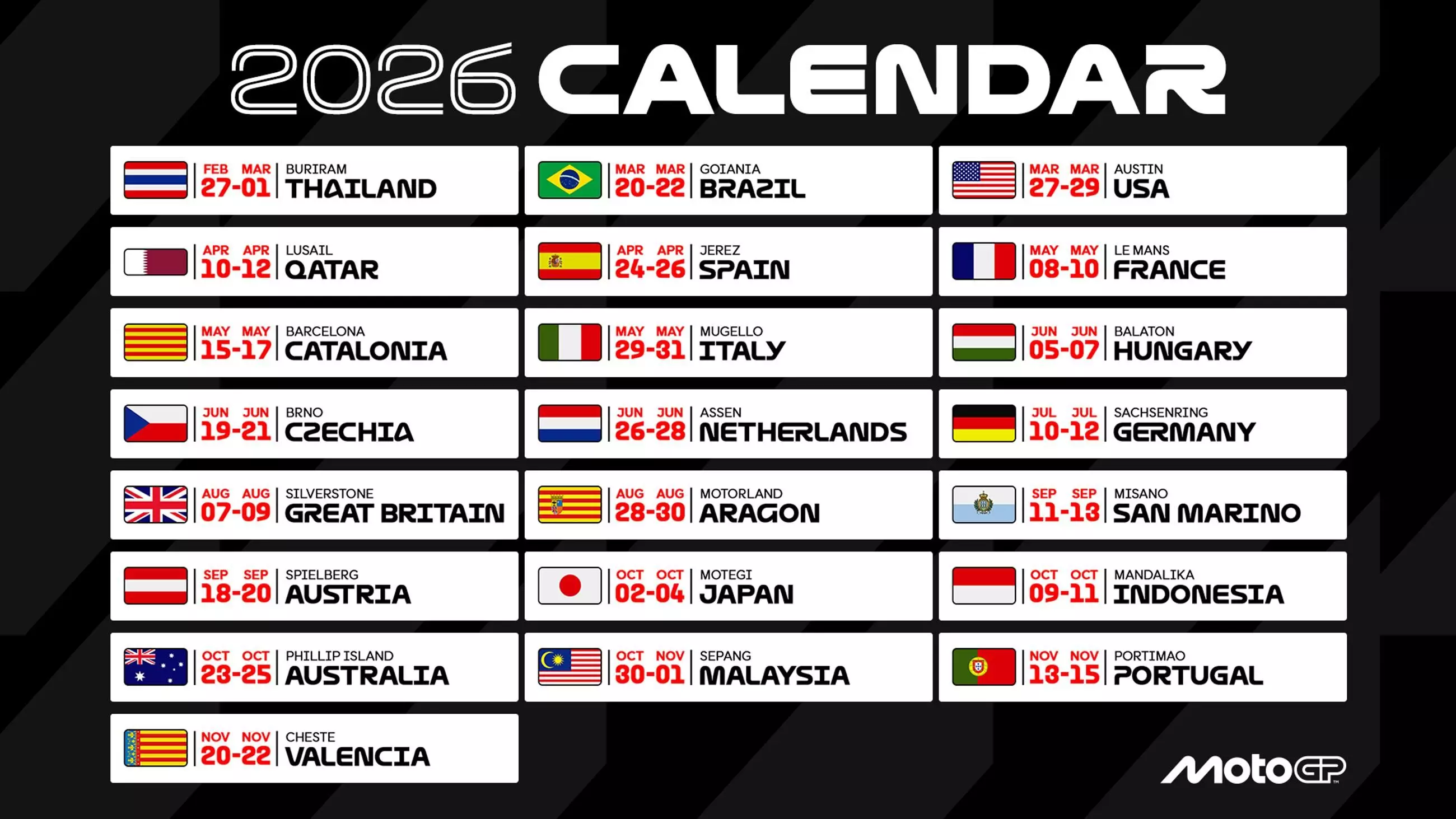 MotoGP 2026 akan digelar di berbagai benua, mulai dari Asia, Eropa, hingga Amerika. Kalender MotoGP 2026 terbaru juga dapat mengalami perubahan karena faktor cuaca atau kondisi tertentu.