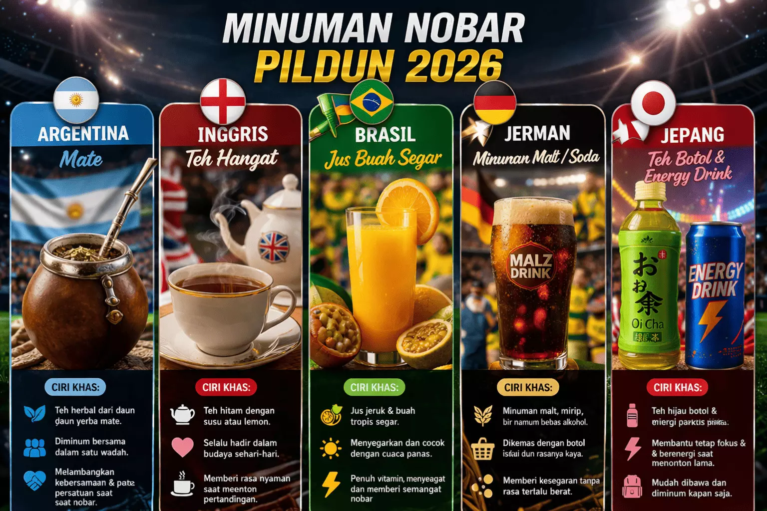 Fenomena ini menunjukkan bahwa meskipun jenis minuman berbeda di tiap negara, tujuannya tetap sama, yaitu menjaga kenyamanan dan energi selama menikmati pertandingan.