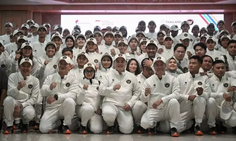 Menteri Pemuda dan Olahraga Erick Thohir (tengah bawah), Wamenpora Taufik Hidayat (kiri bawah), Ketua Umum Komite Olimpiade Indonesia (NOC Indonesia) Raja Sapta Oktohari (kedua kiri, bawah), CdM Kontingen Indonesia untuk SEA Games 2025 Bayu Priawan Djokosoetono (ketiga kanan, bawah) berfoto bersama atlet usai upacara pengukuhan tim Indonesia untuk SEA Games 2025 di kantor Kemenpora, Jakarta, Jumat (5/12/2025). Tim Indonesia menurunkan 1.021 atlet yang akan bertanding di 49 dari 51 cabang olahraga yang dipertandingkan dalam SEA Games 2025 di Thaliand pada 9-20 Desember 2025. ANTARA FOTO/Fauzan/tom.
