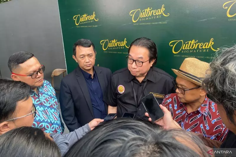 Ketua Harian KONI Kota Bekasi Agus Irianto (jas hitam) bersama Ketua POBSI Kota Bekasi Zaiman Makmur Affan (kemeja hitam) saat menghadiri pembukaan tempat usaha Outbreak Signature di kawasan komersial Summarecon Bekasi pada Jumat (10/4/2026).ANTARA/Pradita Kurniawan Syah.