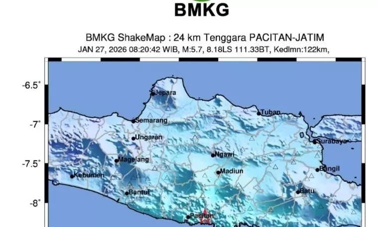 Sebelumnya, gempa bumi terjadi pada pukul 09.20 WITA pada Selasa memiliki magnitudo yang diperbarui mencapai 5,7 dari semula 5,5 dan berlokasi di darat 24 kilometer arah Tenggara Pacitan, Jawa Timur, pada kedalaman 122 kilometer.