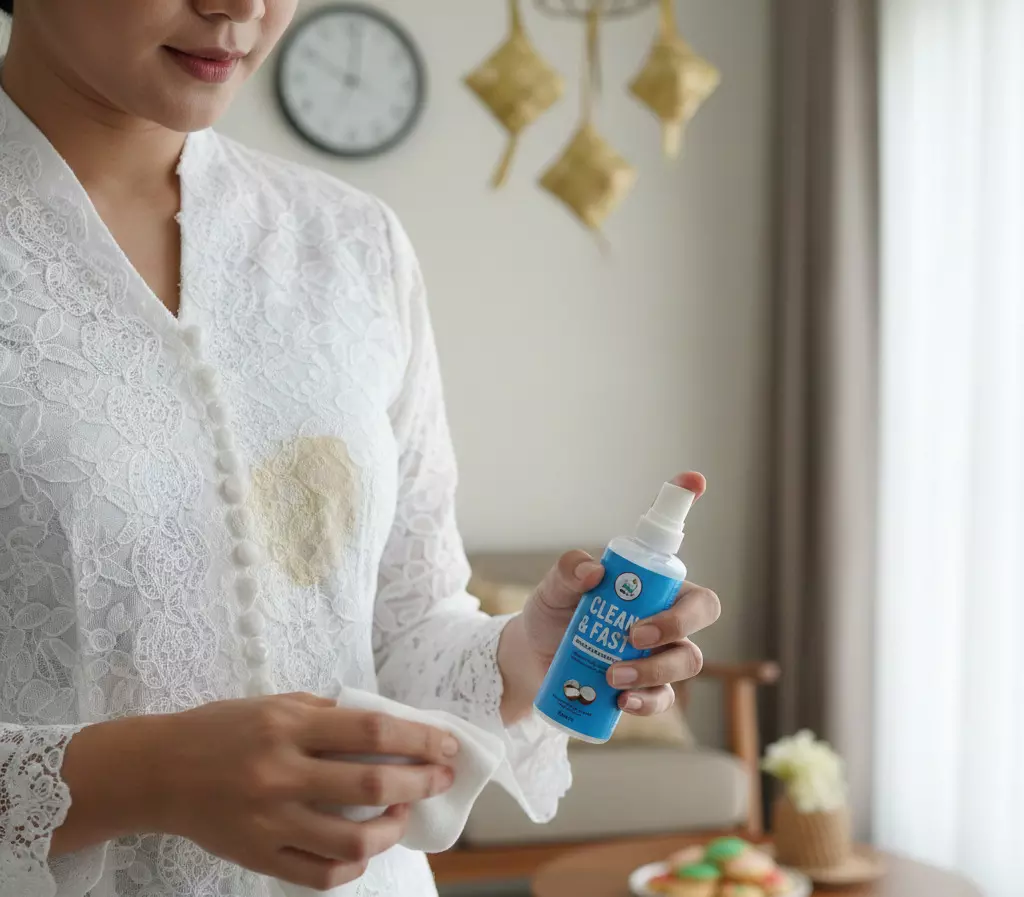 Kecepatan adalah kunci. Segera serap sisa santan menggunakan tisu atau kain bersih, tekan pelan, jangan digosok agar noda tidak menyebar. Setelah itu, teteskan sedikit deterjen cair dan diamkan 10 menit agar formulanya bekerja optimal. Untuk noda pekat, tambahkan cairan penghilang noda aman untuk warna, dan selalu uji di bagian dalam jahitan baju.