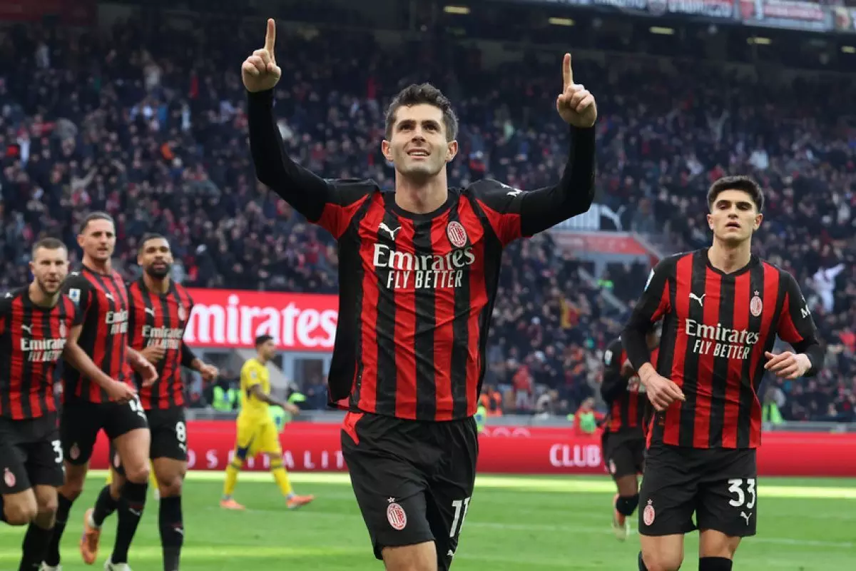 Selebrasi Christian Pulisic setelah mencetak gol untuk AC Milan dalam pertandingan Liga Italia 2025/26 atas Hellas Verona di Stadion San Siro pada Minggu (28/12/2025). ACMilan.com