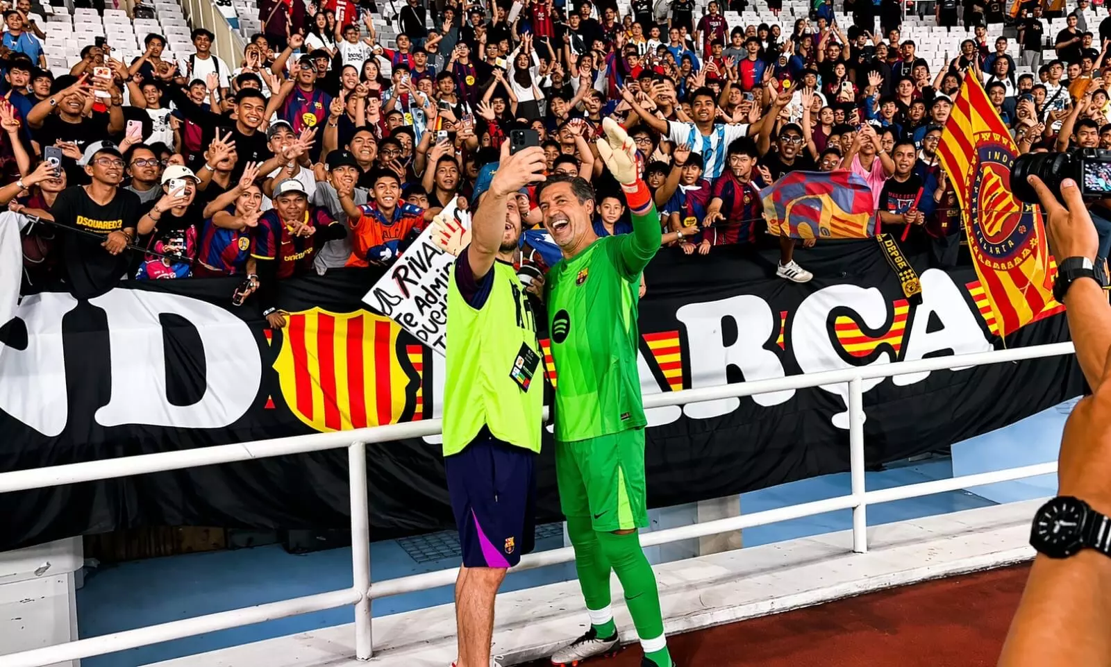Sorín, yang tampil penuh energi di lapangan, berjalan mendekat ke arah tribun. Dengan senyum lebar, ia mengambil ponsel dan mengarahkan kamera depan—mengajak ratusan fans untuk ikut dalam satu frame. Seketika, tribun berubah menjadi lautan ekspresi bahagia, dengan poster dan bendera Barca yang ikut meramaikan momen swafoto tersebut.