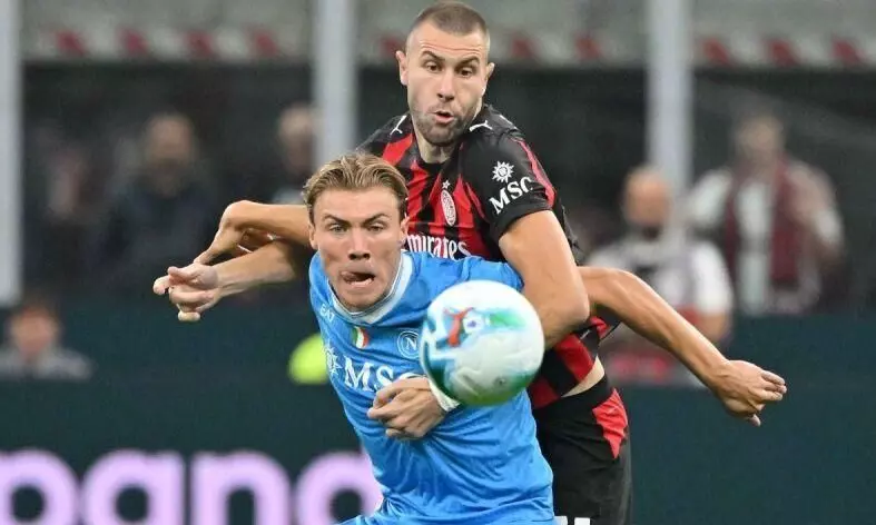 Foto arsip - Pesepak bola AC Milan Strahinja Pavlovic (kanan) berebut bola dengan pemain Napoli Rasmus Hojlund dalam pertandingan Serie A di Milan, Italia, Senin (29/9/2025). AC Milan berhasil merebut puncak klasemen setelah menang atas Napoli dengan skor 2-1. (ANTARA FOTO/Xinhua/Alberto Lingria/nym.)