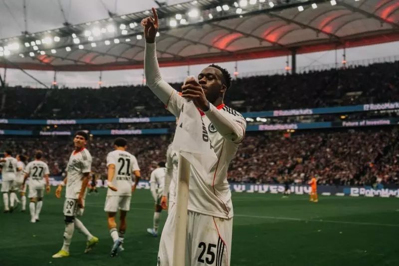 Penyerang Eintracht Frankfurt Arnaud Kalimuendo merayakan keberhasilannya mencetak gol ke gawang Koln pada pertandingan Liga Jerman di Stadion Deutsche Bank Park, Frankfurt, Minggu (5/4/2026) waktu setempat. (x.com/Eintracht)