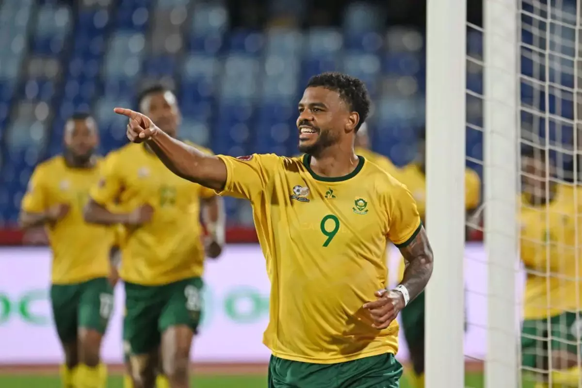 Penyerang Timnas Afrika Selatan Lyle Foster (9) merayakan keberhasilannya mencetak gol ke gawang Timnas Angola di Stadion Marrakech, Ouahat Sidi Brahim, Senin (22/12/2025) waktu setempat. (cafonline.com)