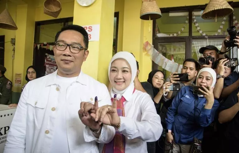 Arsip foto- Calon gubernur (Cagub) DKI Jakarta nomor urut 1 Ridwan Kamil (kiri) bersama istri sekaligus Anggota Komisi VIII DPR RI Atalia Praratya (kedua kiri) menunjukkan tinta pada jari usai menggunakan hak pilihnya menggunakan hak pilihnya pada pilkada serentak 2024 di Tempat Pemungutan Suara (TPS) 23 Kelurahan Ciumbuleuit, Bandung, Jawa Barat, Rabu (27/11/2024). ANTARA FOTO/Novrian Arbi/wpa. (ANTARA FOTO/NOVRIAN ARBI)