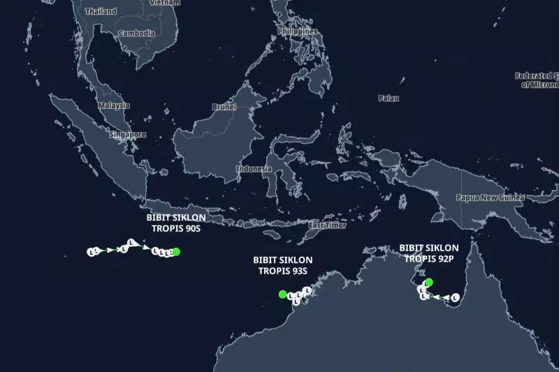 Tangkapan layar yang memperlihatkan posisi tiga bibit siklon tropis di wilayah selatan Indonesia, Rabu (4/3/2026). (ANTARA/HO-TCWC Jakarta)