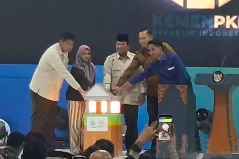 Presiden RI Prabowo Subianto bersama Menteri Koordinator Bidang Infrastruktur dan Pembangunan Kewilayahan Agus Harimurti Yudhoyono serta Menteri Perumahan dan Kawasan Permukiman Maruarar Sirait menghadiri Akad Massal 50.030 KPR FLPP di Serang, Banten pada Sabtu (20/12/2025). (ANTARA/Aji Cakti).