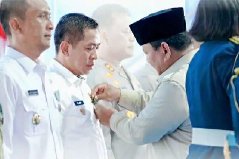 Tanda kehormatan itu diberikan dan dipasangkan secara langkah oleh Presiden Prabowo dalam agenda panen raya nasional sekaligus pengumuman capaian swasembada pangan di Kecamatan Cilebar, Kabupaten Karawang, Jawa Barat, Rabu
