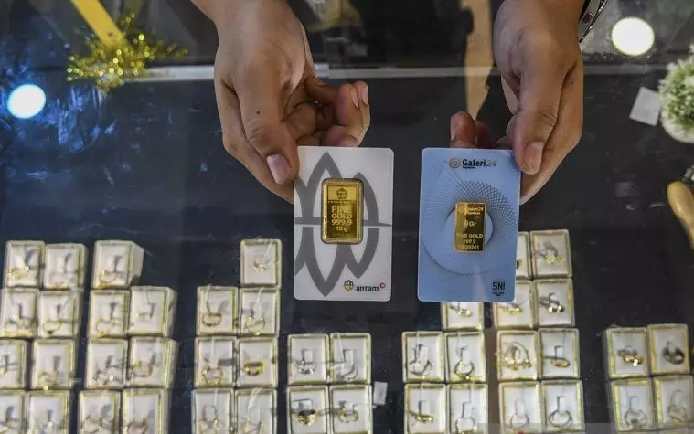 Arsip foto - Karyawan menunjukkan emas di Kantor Pusat Galeri 24 Pegadaian, Jalan Salemba Raya, Jakarta. Harga emas yang dikutip dari laman resmi Pegadaian, Minggu (20/7/2025) menunjukkan harga dua produk logam mulia, yakni buatan UBS dan Galeri24 yang mengalami fluktuasi harga jual dari hari sebelumnya. ANTARA FOTO/Galih Pradipta/rwa/pri. (ANTARA FOTO/GALIH PRADIPTA)