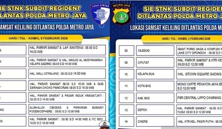 Berikut wilayah layanan Samsat Keliling di Jadetabek sesuai info akun X resmi TMC Polda Metro Jaya @tmcpoldametro: