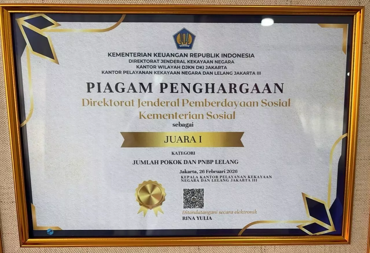 Penghargaan diberikan dalam kegiatan Apresiasi dan Sosialisasi Pengelolaan Kekayaan Negara dan Lelang di Kantor KPKNL Jakarta III, Selasa (4/3/2026).