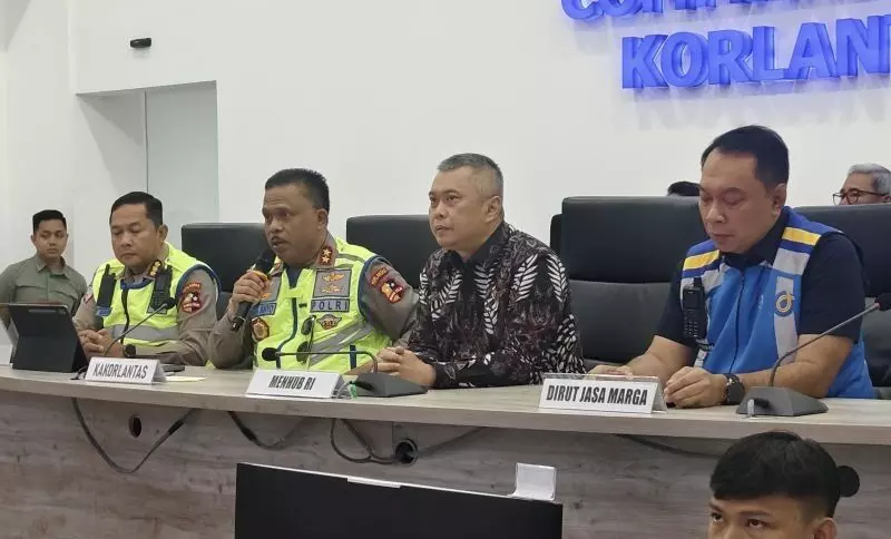 Kepala Korlantas (Kakorlantas) Polri Irjen Pol. Agus Suryonugroho (kedua dari kiri) memberikan keterangan pers di Posko Command Center Korlantas Polri KM 29 Tol Cikampek, Kabupaten Bekasi, Jawa Barat, Jumat (27/3/2026). (ANTARA/Nadia Putri Rahmani)