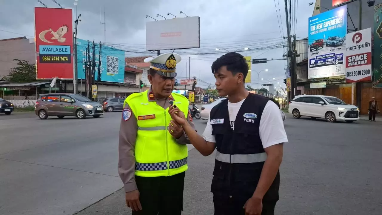 KBO Lantas Kota Tegal Iptu MK Harris saat diwawancarai Awaluddin Marifatullah dari Ekspedisi Elshinta Jelang Mudik Lebaran 2026, di Pos Polisi Maya, Kota Tegal, Jumat (6/3/2026)