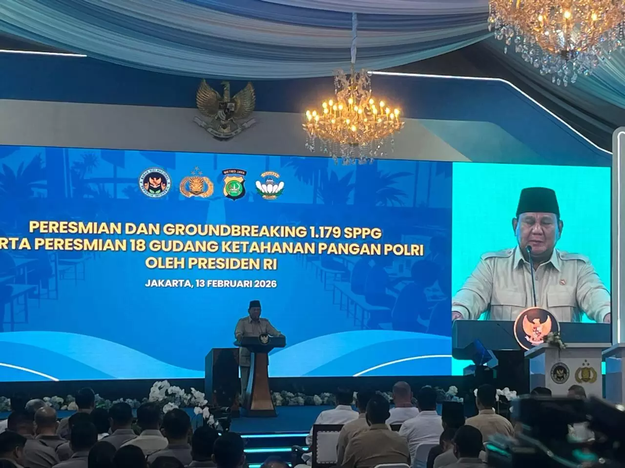 Presiden Prabowo Subianto menghadiri peresmian dan groundbreaking 1.179 Satuan Pelayanan Pemenuhan Gizi (SPPG) serta peresmian 18 gudang ketahanan pangan Polri di Kantor Polsek Jakarta Barat, Jumat (13/2/2026).