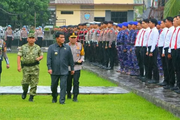 Apel gelar pasukan dipimpin Gubernur Sulut Yulius Selvanus, didampingi Kapolda Sulut Irjen Pol Roycke Harry Langie dan Pangdam XIII/Merdeka Mayjen TNI Mirza Agus, di Lapangan Presisi Polda Sulut, Jumat (19/12/2025) sore.