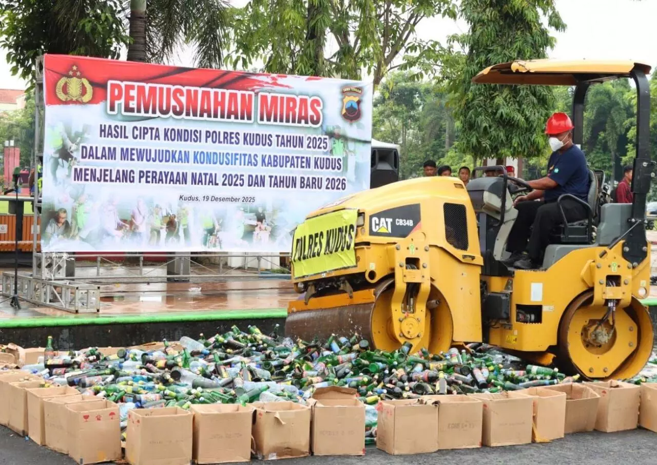 Ribuan botol minuman keras (miras) dimusnahkan oleh Polres Kudus jelang operasi Lilin Candi 2025. Miras tersebut merupakan hasil kegiatan cipta kondisi sebagai upaya mewujudkan situasi kamtibmas yang aman dan kondusif di wilayah Kabupaten Kudus, Jumat (19/12).
