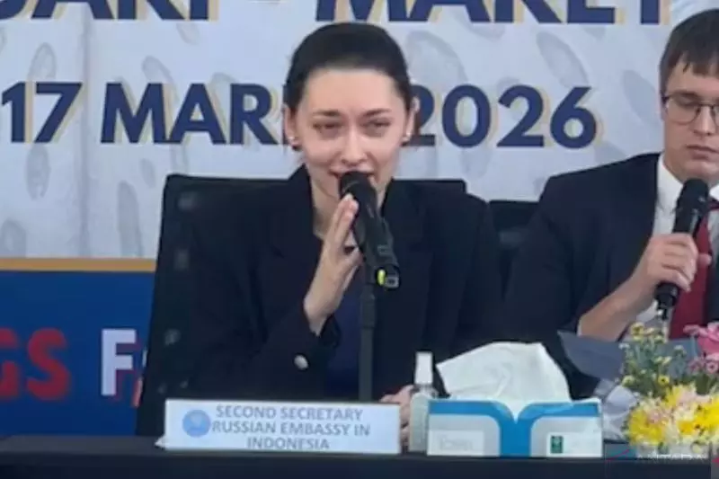 Sekretaris Kedua Kedubes Rusia di Indonesia Olesya Netesova dalam konferensi pers pemusnahan barang bukti narkotika di Jakarta, Selasa (17/3/2026). (ANTARA/Agatha Olivia Victoria).