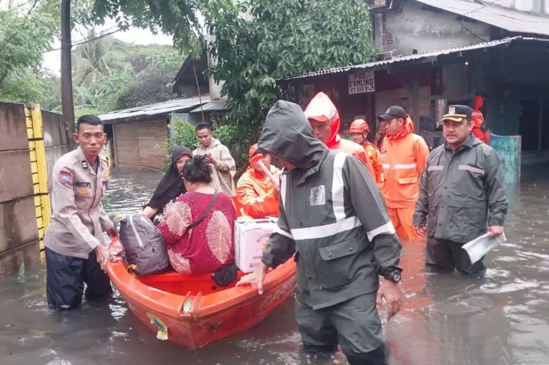 Petugas gabungan di Kelurahan Cakung Barat mengevakuasi warga yang kebanjiran akibat hujan berintensitas tinggi sejak Minggu dini hari dan membuka dapur umum di halaman kantor kelurahan.