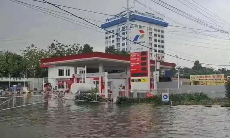 SPBU Pertamina di sisi jalan pun terlihat lumpuh dan tidak beroperasi akibat turut terendam banjir. Pagar SPBU yang berwarna hitam itu tertutup rapat lengkap dengan gembok dan rantai di bagian depannya.