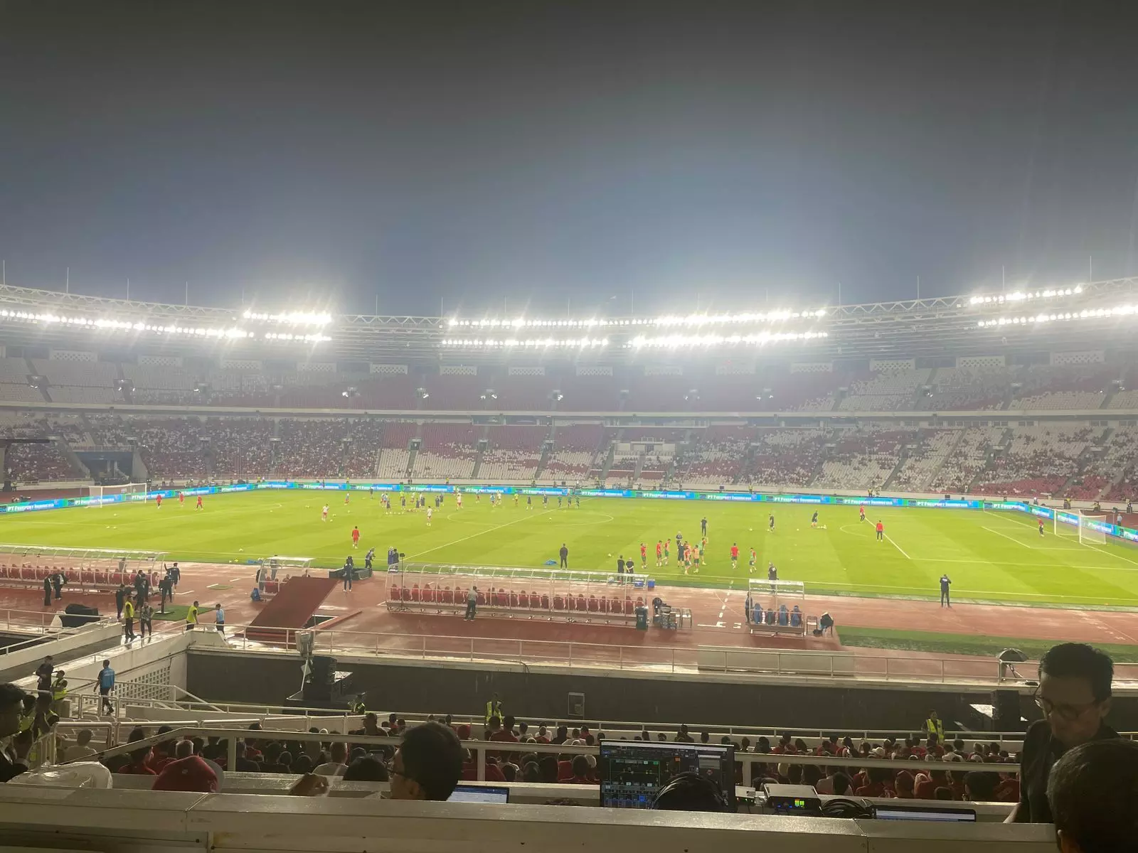 Area bangku cadangan juga terlihat sibuk. Official tim, pelatih, dan staf medis hilir mudik memastikan semua persiapan berjalan lancar. Kamera-kamera media dan kru siaran televisi sudah bersiap di pinggir lapangan, mengabadikan momen-momen menjelang laga. Dari sudut pandang tribun tengah, terlihat jelas bagaimana intensitas aktivitas meningkat seiring mendekatnya waktu kick-off.