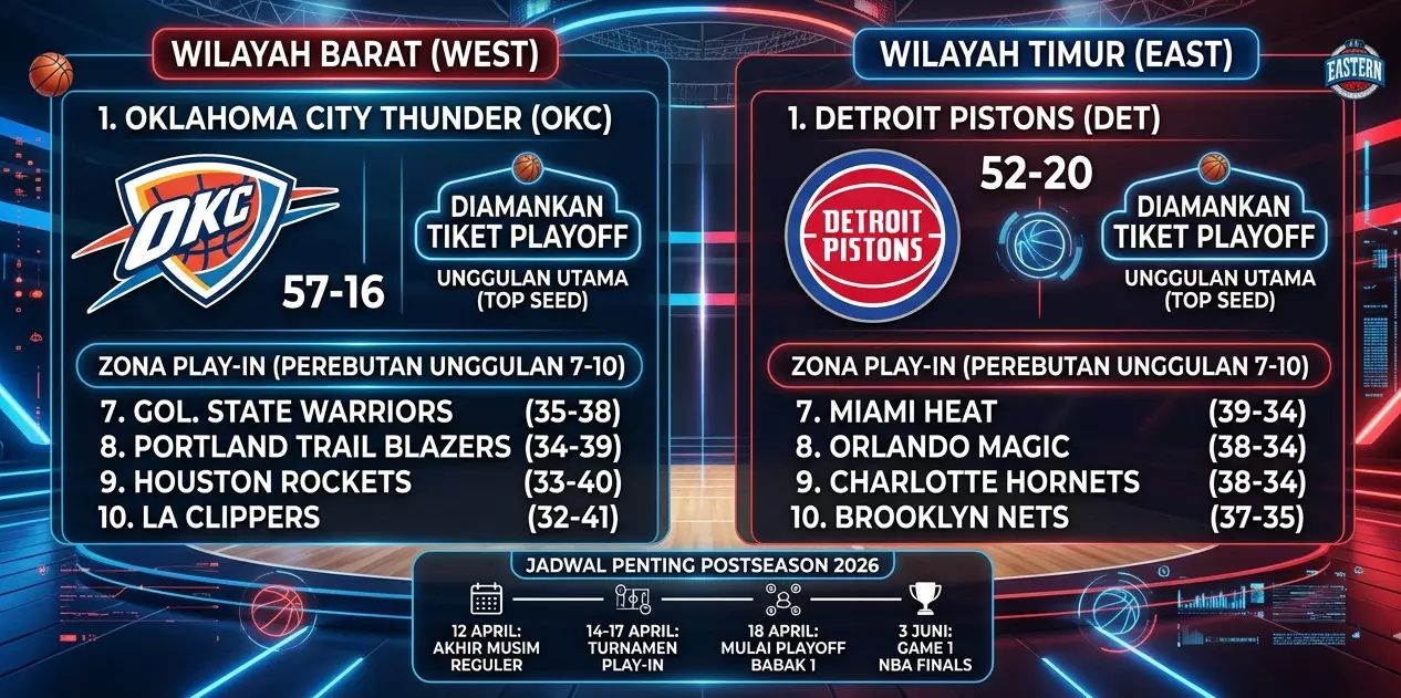 Update klasemen NBA Maret 2026: Thunder & Pistons amankan tiket Playoff. Cek peta persaingan zona Play-In Wilayah Barat dan Timur selengkapnya di sini!