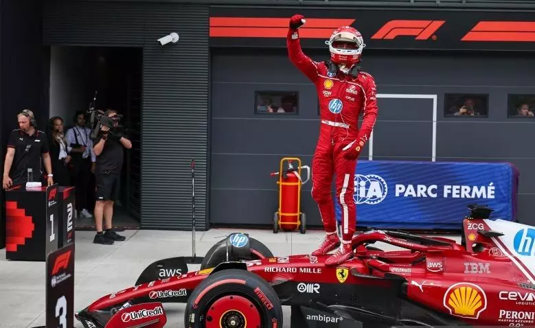 Pembalap Ferrari asal Monako Charles Leclerc merayakan kemenangan diatas mobilnya seusai sesi kualifikasi Formula Satu Grand Prix di Hungaroring, Mogyorod, Budapest, Hungaria, Sabtu (2/8/2025). ANTARA FOTO/Xinhua/Qian Jun/agr