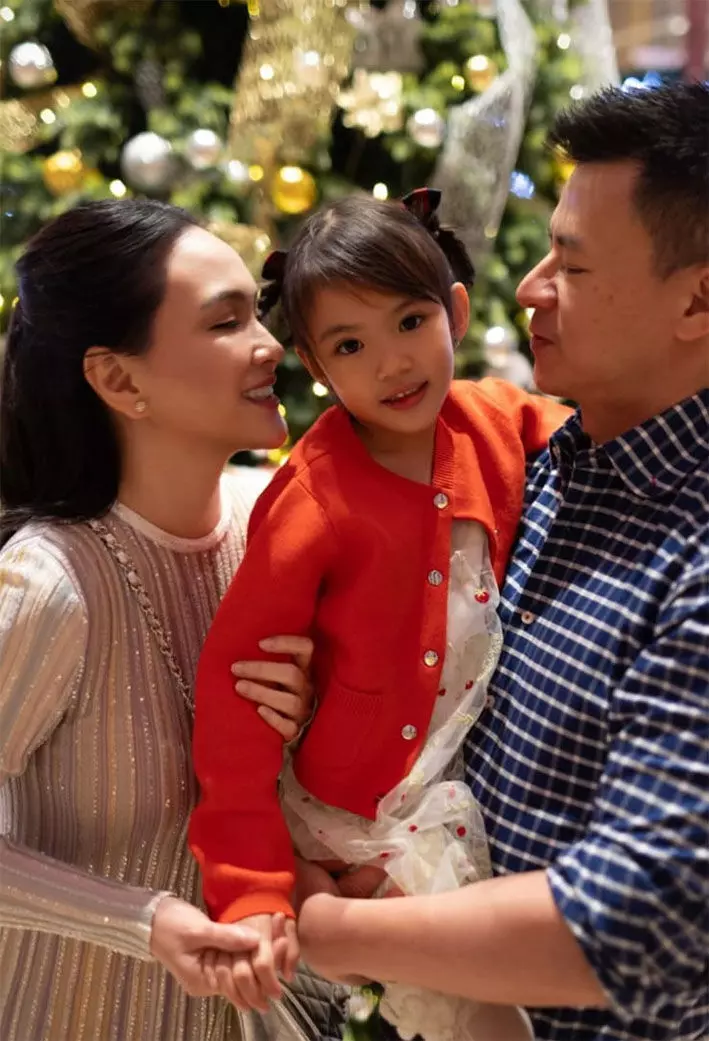 Shandy tampil anggun mengenakan dress lengan panjang berwarna peach. Sementara Claire terlihat manis dengan cardigan merah, dan David Herbowo tampil santai mengenakan kemeja kotak-kotak biru. Potret tersebut memancarkan suasana hangat dan penuh keakraban, layaknya keluarga utuh.