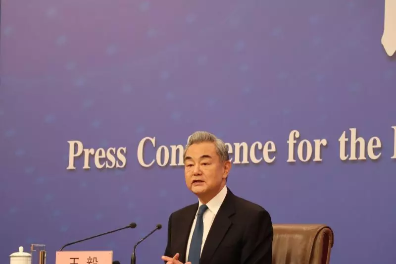Menlu Wang Yi menjawab dalam konferensi pers soal "Kebijakan diplomasi dan hubungan luar negeri China" di Beijing, China pada Minggu (8/3/2026). (ANTARA/Desca Lidya Natalia).