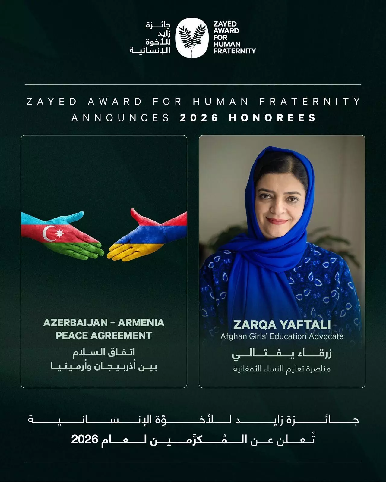 Abu Dhabi, Uni Emirat Arab, 19 Januari 2026 — Zayed Award for Human Fraternity mengumumkan penerima penghargaan tahun 2026, yakni perjanjian perdamaian bersejarah antara Republik Azerbaijan dan Republik Armenia, serta tokoh advokasi pendidikan anak perempuan Afghanistan, Zarqa Yaftali. Penetapan ini menandai pertama kalinya penghargaan tersebut diberikan kepada penerima dari kawasan Kaukasus dan Afghanistan.