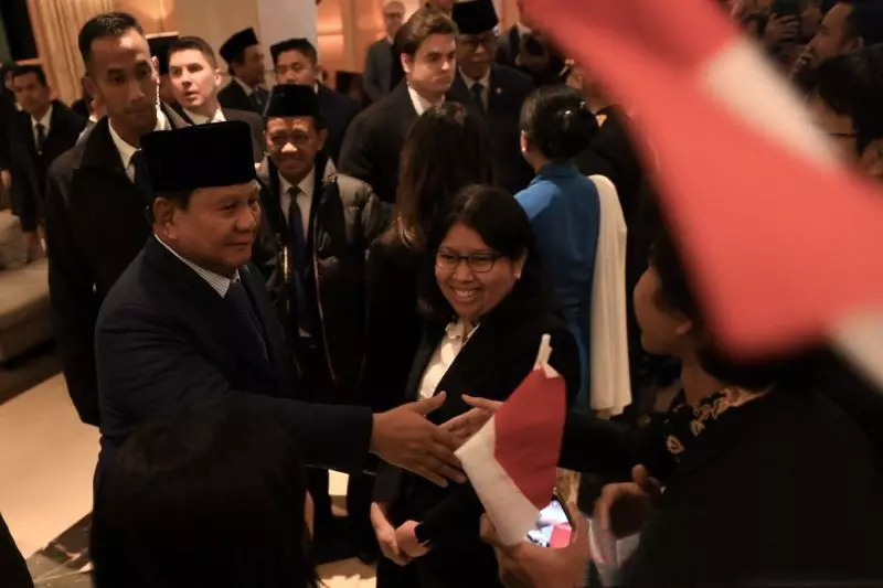 Presiden Prabowo, saat menyusuri area lobi, menyalami satu per satu diaspora dan mahasiswa yang menyambut dirinya seraya mengucapkan: "Terima kasih ya, terima kasih".