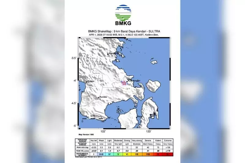 "Wilayah Kota Kendari diguncang gempa bumi tektonik," kata dia.