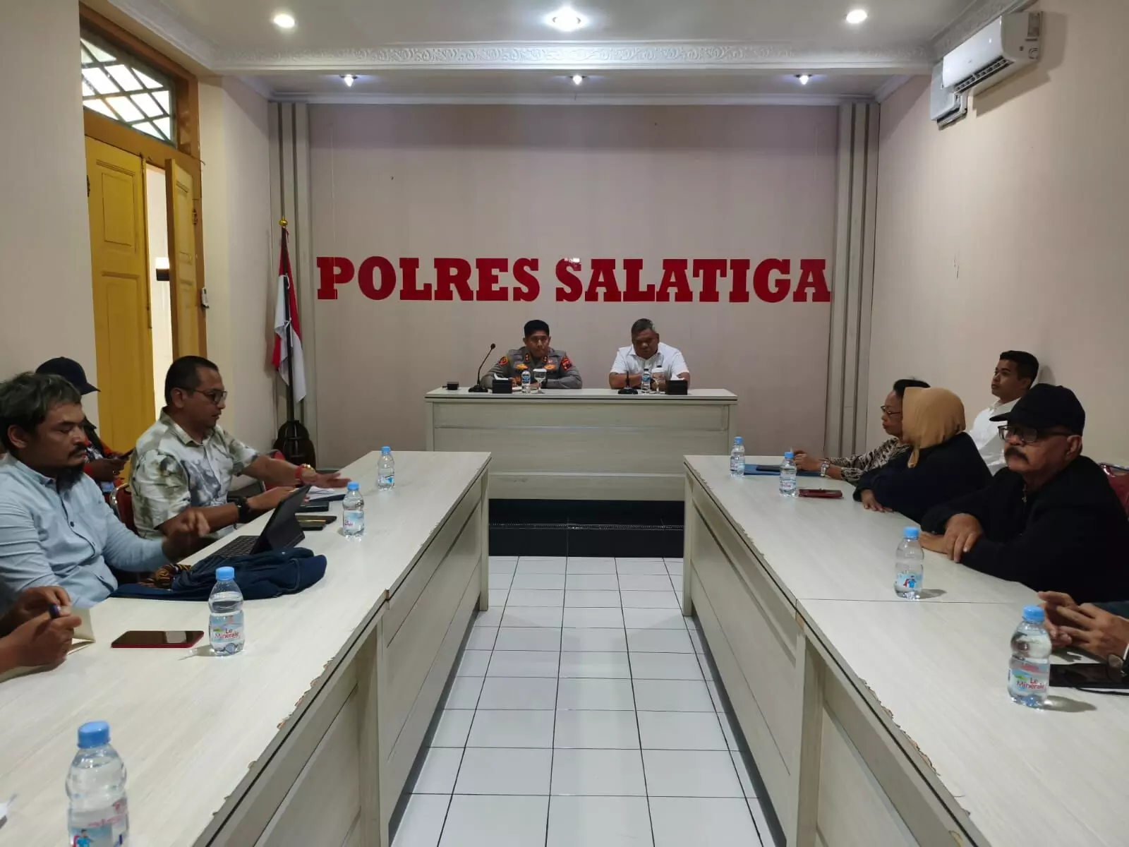 Kapolres Salatiga AKBP Ade Papa Rihi bersama Kasubdit II Ditreskrimsus Polda Jawa Tengah AKBP Rango Siregar menggelar audiensi dengan para korban dugaan penipuan berkedok investasi BLN di Aula Mapolres Salatiga, Senin (19/1/2026).