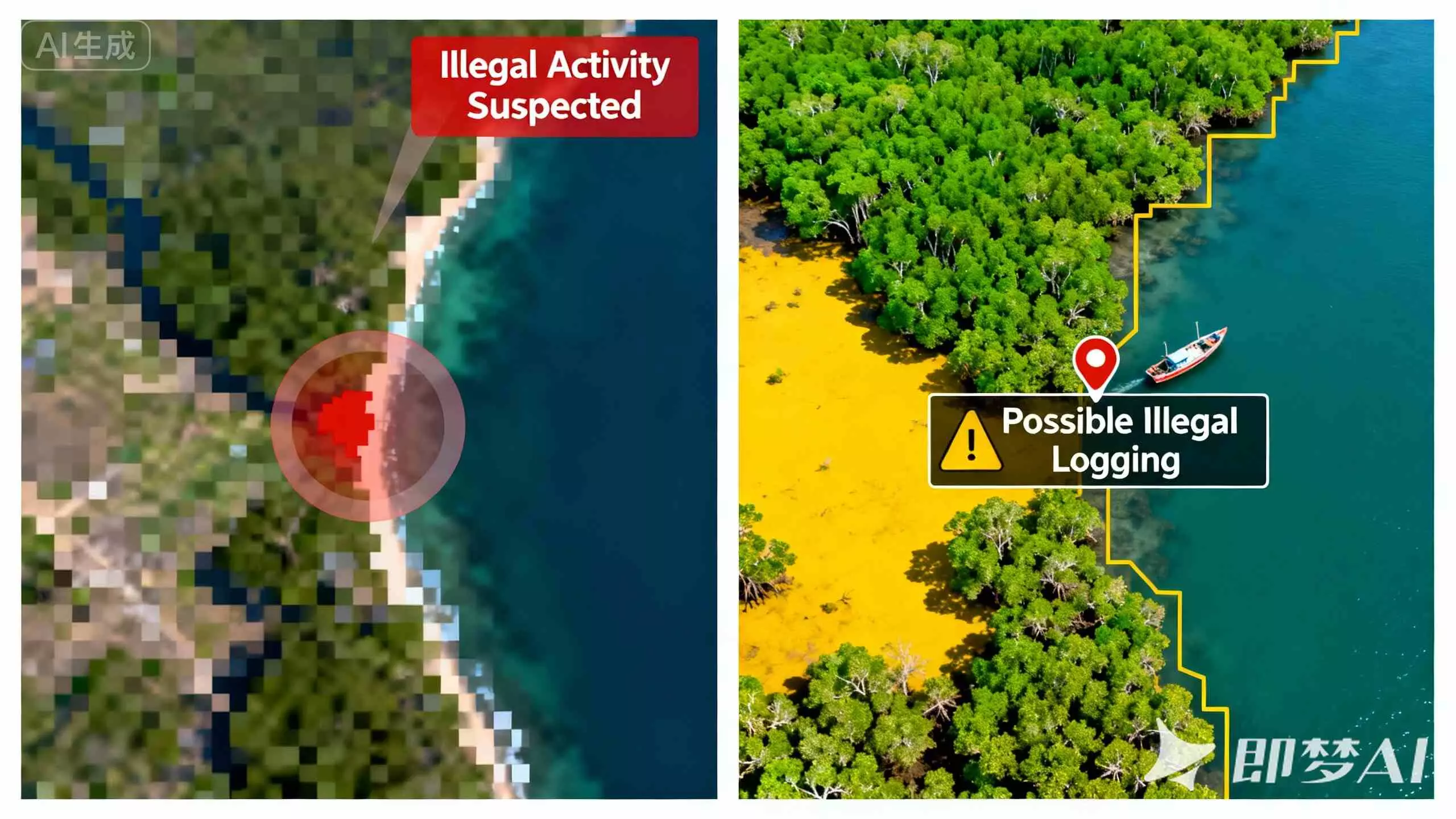 Di sebelah kiri, hanya ada kotak merah mencurigakan pada citra satelit yang buram dan kabur; di sebelah kanan, citra yang sama setelah dianalisis AI, kesehatan hutan bakau dibedakan dengan jelas dalam warna hijau dan kuning, sebuah kapal kecil yang diduga melakukan penebangan liar terlacak secara tepat. Lompatan dari "kecurigaan samar" menjadi "wawasan presisi" inilah kemampuan pemantauan yang diberikan AI bagi penjaga ekosistem pesisir Indonesia yang berharga – hutan bakau – dengan presisi tinggi dan siaga 24 jam.