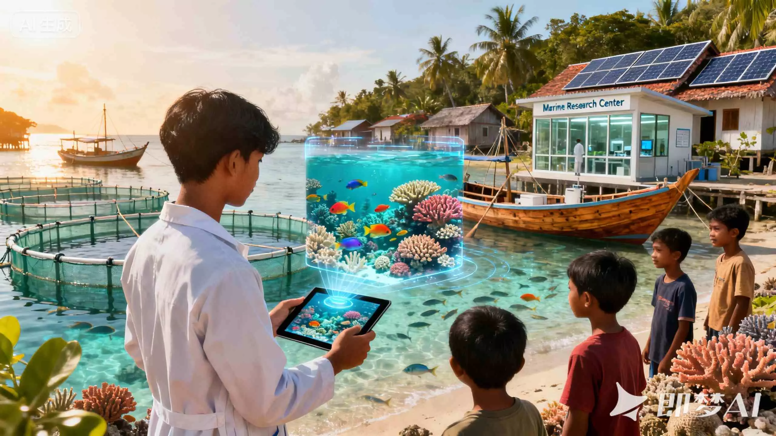 Dalam sebuah adegan masa depan yang penuh harap: Seorang biologis kelautan muda Indonesia di desa pesisir menggunakan tablet untuk menunjukkan hologram terumbu karang yang subur kepada anak-anak setempat. Di latar belakang, keramba budidaya berkelanjutan yang dioptimalkan AI berdekatan dengan kapal penangkap ikan tradisional yang bersih. Panel surya dan stasiun penelitian kecil terlihat. Ini bukan hanya visi, tetapi cetak biru yang dapat diwujudkan: lautan yang diberdayakan teknologi, di mana vitalitas ekonomi dan kesehatan ekologis seimbang, generasi penerus akan belajar menjaga warisan biru mereka dengan penuh kebijaksanaan.