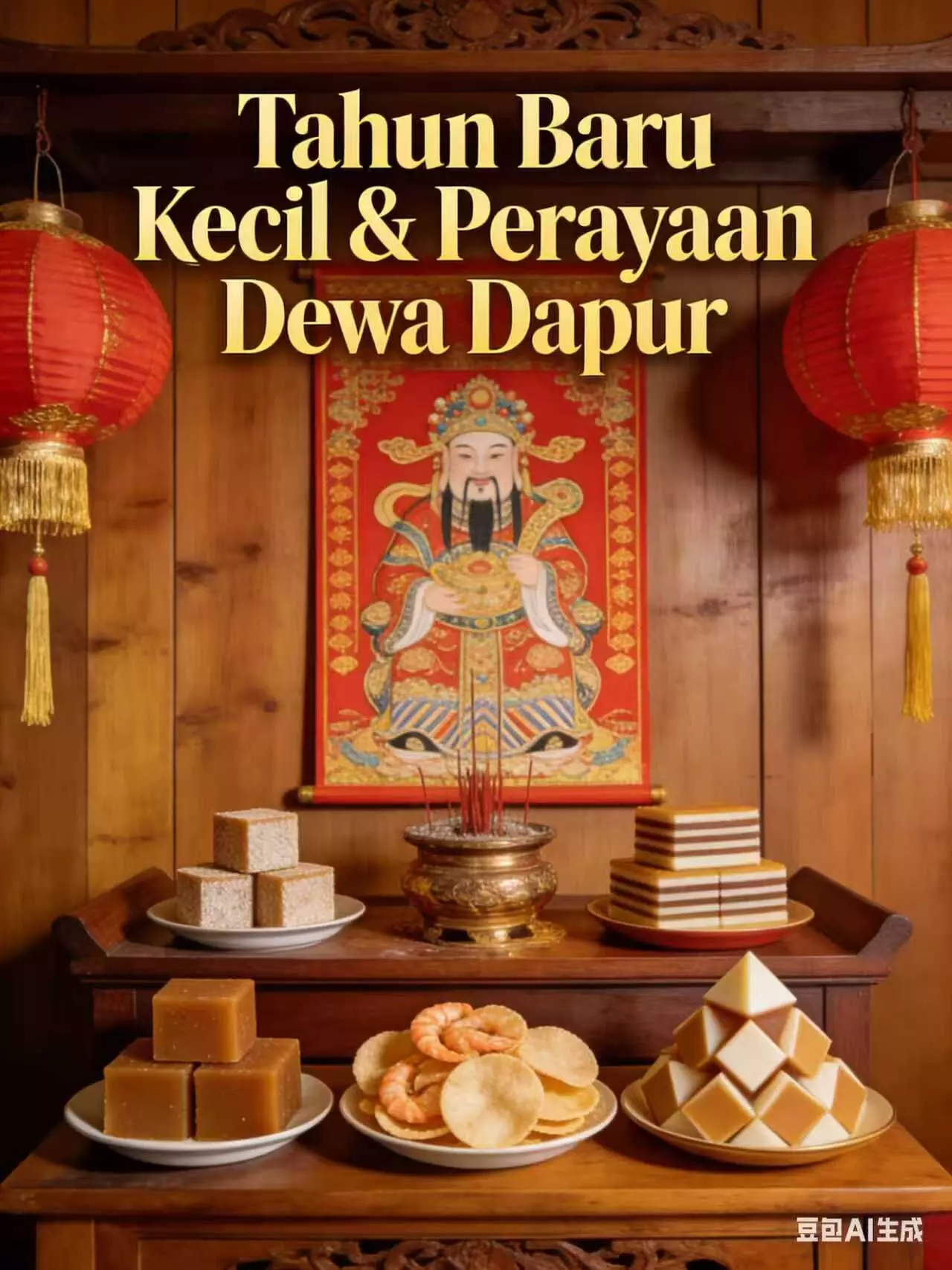 Di atas meja persembahan untuk Dewa Dapur, gula cair dan dodol berdampingan, sedangkan kue keranjang tradisional sering dinikmati dengan santan. Setelah pembersihan besar-besaran, keranjang belanjaan tahunan yang disiapkan tidak hanya berisi daging asap Tiongkok, tetapi juga kerupuk Indonesia dan kue lapis.