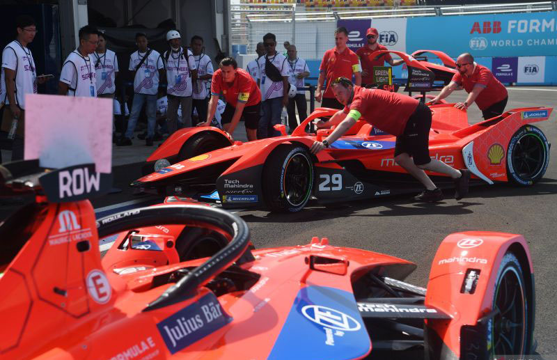 Kru tim Mahindra Racing mempersiapkan mobil jelang balap Formula E di Jakarta International E-Prix Circuit (JIEC) di Jakarta, Jumat (3/6/2022). ANTARA FOTO/Wahyu Putro A/aww.Elshinta.com - Balapan mobil listrik Formula E di Jakarta E-Prix International Circuit (JIEC) Ancol, Sabtu (4/6) bakal disiarkan secara langsung oleh salah satu televisi nasional dan dengan demikian masyarakat yang tidak memiliki tiket tetap bisa melihat kejuaraan yang baru pertama kali digelar di Indonesia itu.