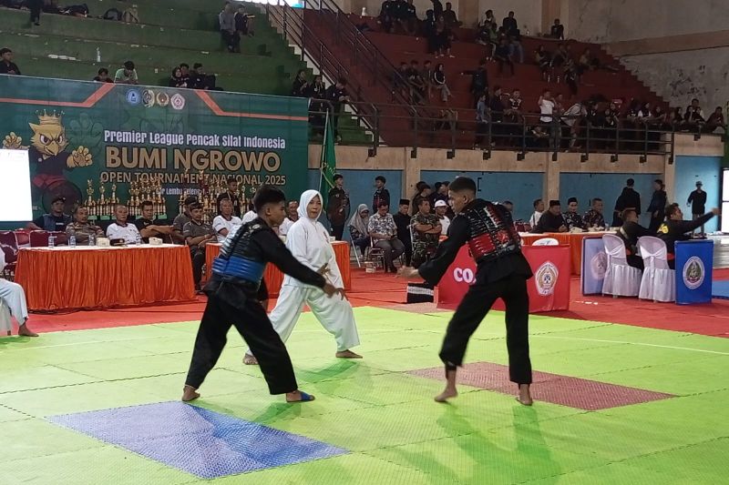 Peserta adu ketangkasan silat dalam kejuaraan silat tingkat nasional bertajuk Premiere league Pencak Silat Bumi Ngrowo Open Tournament Nasional 2025 di GoR lembupeteng, Tulungagung, Jumat (11/4/2025 (ANTARA/HO - Joko Pramono)Elshinta.com - Bupati Tulungagung, Maryoto Birowo membuka kejuaraan pencak silat nasional bertajuk Premiere League Pencak Silat Indonesia Bumi Ngrowo Open Tournament Nasional 2025 di GOR Lembu Peteng, Jumat (11/4).